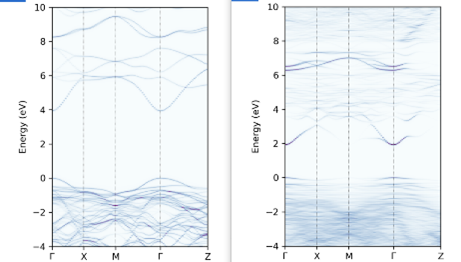 Left: Wide band gap semiconductor materials with tunable band gap through disordering. Right: High-throughput prediction of nitride perovskites and verifying their stability using AIRSS.